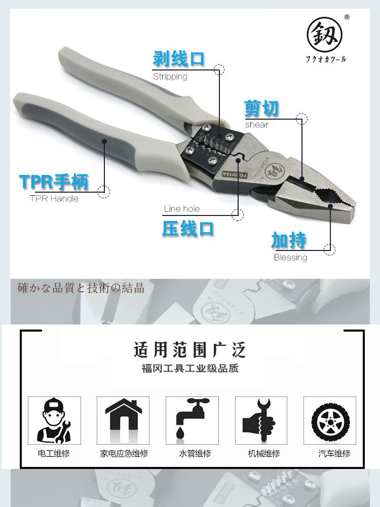 Japan Fukuoka Tools Industrial Class Kersey Tank 8-inch multifunctional strip wire fit pliers Tiger pliers import technology