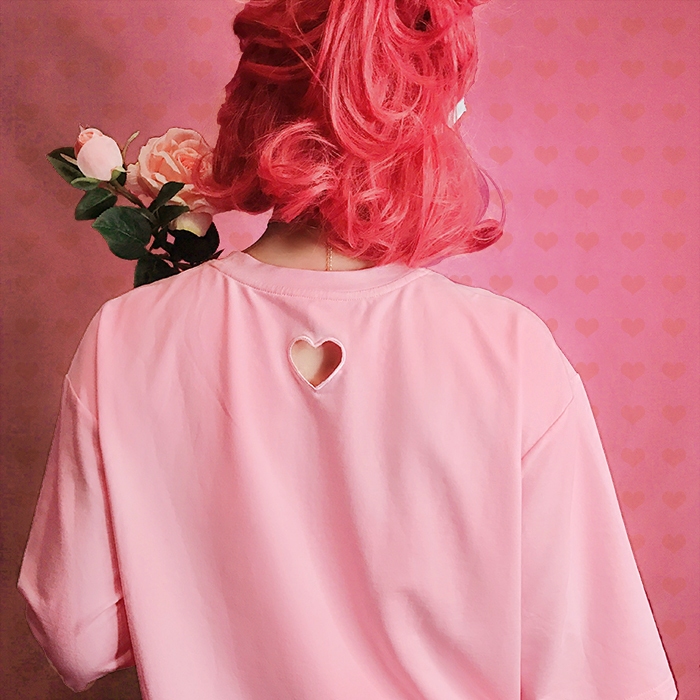 EOH original design-crush girl-PVC love embroidery loose and thin T-shirt OP soft girl tender pink T cutout