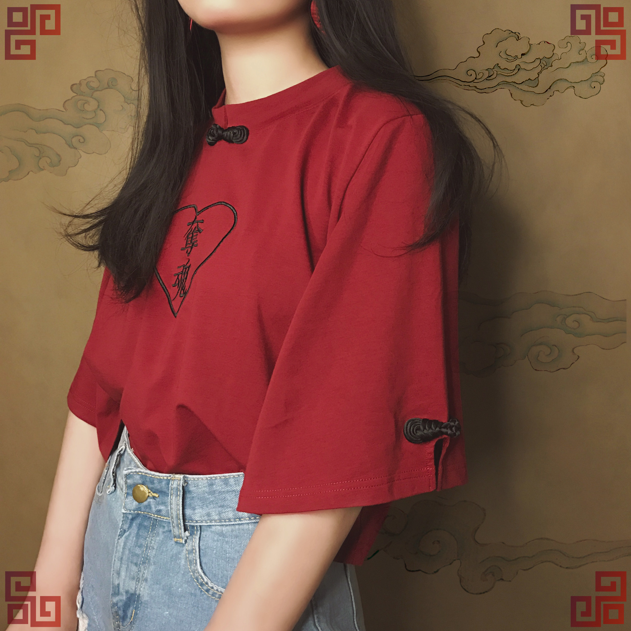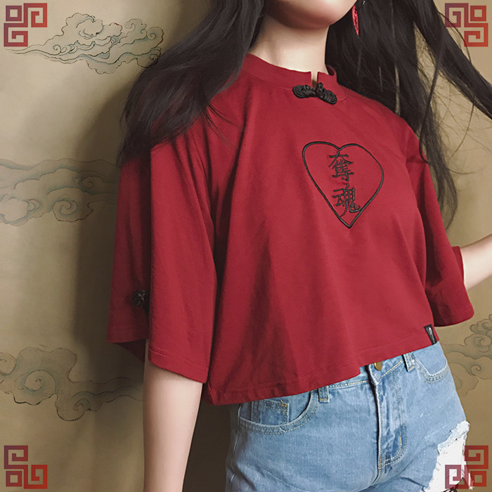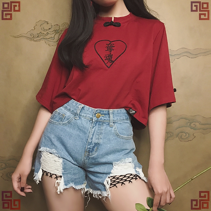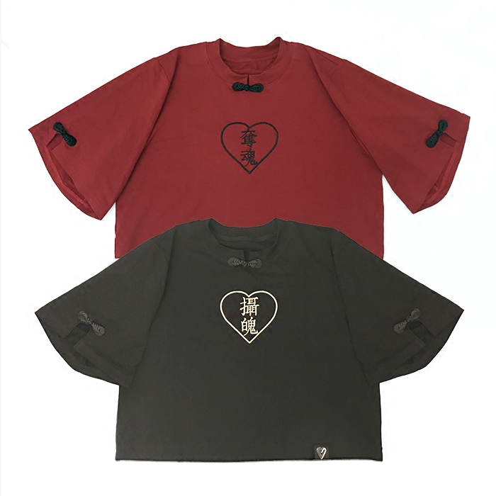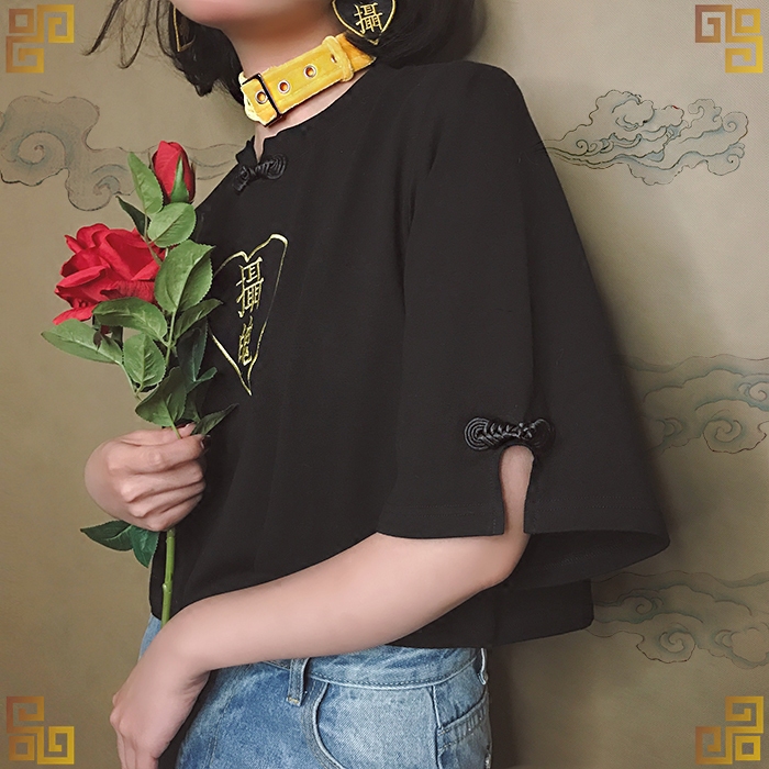 EOH original design-Girl Mafia-Soul Everbent Gemini Gemini Gemini Sleeves Embroider Loose Medium Disc Buckle T-shirtZoom