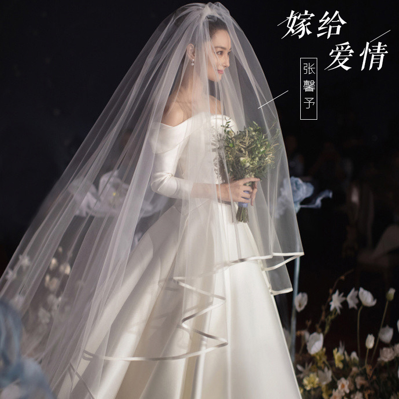Zhang Xinyu headdress bride's main wedding dress white long champagne color trailing headdress super immortal forest wedding vintage